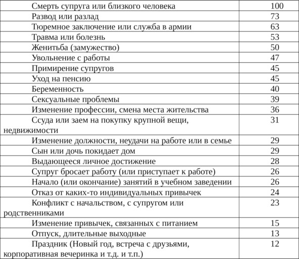Самое примечательное в этой таблице, что и радости — всевозможные праздники, отпуск, женитьба и удачные события также сопряжены со стрессами.