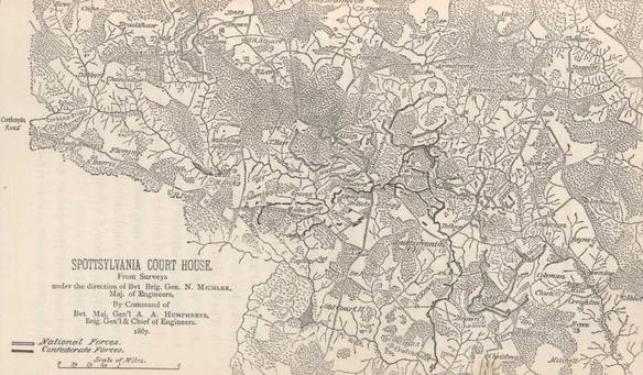 The night of the 13th Warren and Wright were moved by the rear to the left of Burnside. The night was very dark and it rained heavily, the roads were so bad that the troops had to cut trees and corduroy the road a part of the way, to get through. It was midnight before they got to the point where they were to halt, and daylight before the troops could be organized to advance to their position in line. They gained their position in line, however, without any fighting, except a little in Wright's front. Here Upton had to contend for an elevation which we wanted and which the enemy was not disposed to yield. Upton first drove the enemy, and was then repulsed in turn. Ayres coming to his support with his brigade (of Griffin's division, Warren's corps), the position was secured and fortified. There was no more battle during the 14th. This brought our line east of the Court House and running north and south and facing west.