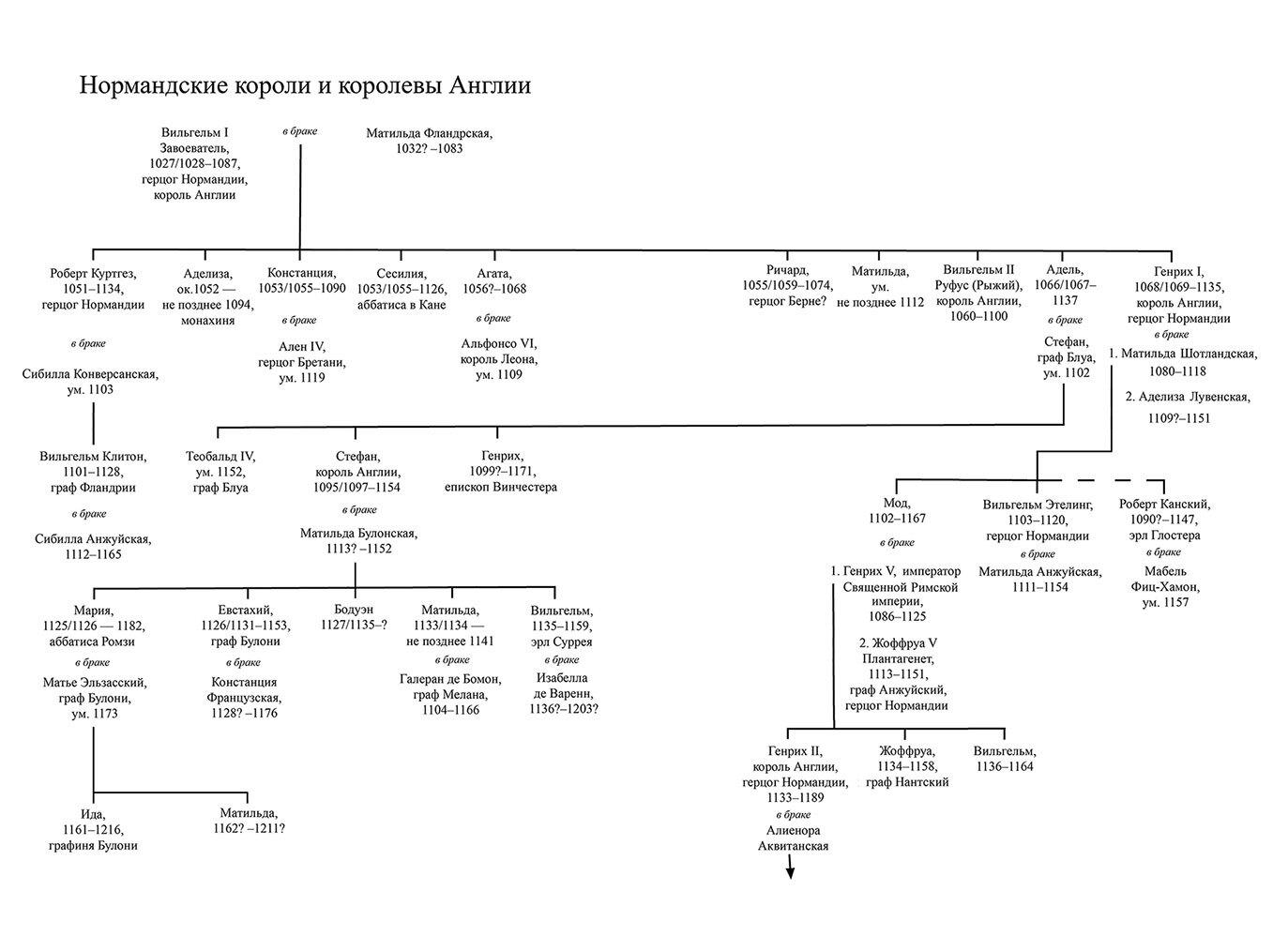Похоже, что Вильгельм выбирал имена сыновьям, а Матильда – дочерям. Матильда гордилась тем, что вела свою родословную от французских королей21. Ее гордость отражена в именах, которыми она нарекла дочерей, и в подписи на хартиях, где она обозначала себя «дочерью Бодуэна, герцога Фламандского» и «племянницей Генриха, самого прославленного короля Франции»22. Констанцию назвали в честь бабушки Матильды, французской королевы Констанции Арльской23, Адель – в честь матери Матильды, принцессы Франции, а Матильду-младшую – в честь самой Матильды Фландрской. Аделизу (Аделиду или Аделаиду – сейчас эти имена взаимозаменяемы), возможно, назвали в честь Аделаиды Аквитанской, супруги короля Франции Гуго Капета; мать королевы Аделаиды, Адель, была дочерью Роллона Нормандского.