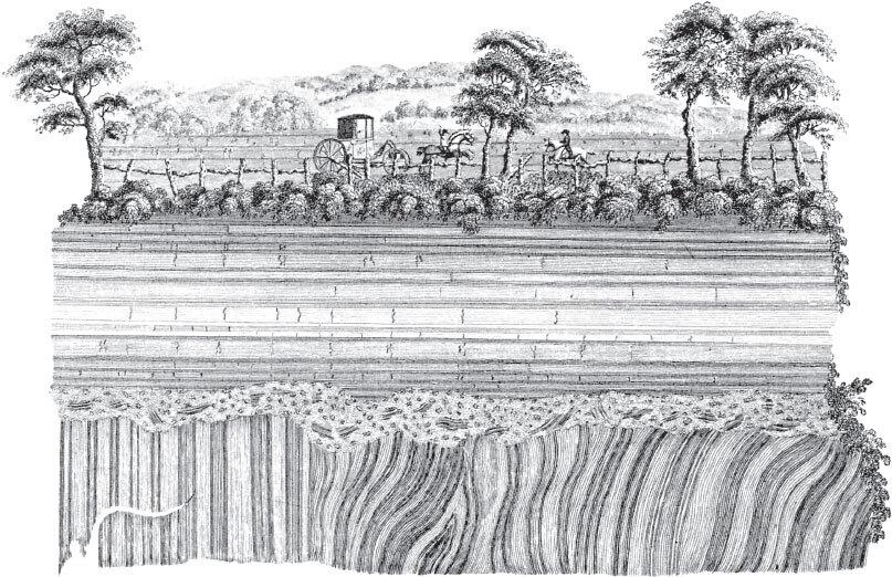 Геттон также исследовал и обсуждал временные пробелы в геологической летописи, которые называются несогласиями (периоды геологического времени, в которых нет остатков горных пород, указывающих на поднятие массива, периоды эрозии или силы, под действием которых старые породы были разрушены в результате выветривания и эрозии, о чем свидетельствуют отсутствующие слои). Эти «неправильные соединения первичных и вторичных слоев» [20] крайне важны для понимания возраста Земли и шкалы геологического времени, потому что они показывают, как формировались слои горных пород в течение огромного периода. Геттон не первым обратил внимание на изменения углов и ориентации слоев горных пород, но он впервые правильно интерпретировал это явление и осознал последствия. Стенон отмечал изменения углов наклона слоев в своем сочинении «О твердом, естественно содержащемся в твердом», опубликованном в 1669 г. [21]. Швейцарские и французские геологи, в том числе Орас Бенедикт де Соссюр, который был еще и альпинистом, сообщали об изменениях в ориентации слоев горных пород в Альпах [22]. Геттону было известно об этих более ранних открытиях, и он занимался поиском соединений, где разные слои находились в контакте. Сначала он исследовал наклонные горные породы на северной оконечности острова Арран, но знал, что ему требуется больше данных. Друзья сообщили Геттону об обнажениях пород вдоль подвергшихся эрозии берегов реки Джед, где слои мергеля (осадочной горной породы из известняка и глины) и песчаника горизонтально залегали над другими слоями с выраженным наклоном. Геттон пришел к выводу, что почти вертикальные слои являются результатом поднятия и они старше, чем покрывающие их горизонтальные слои. Он утверждал, что какое-то событие разрушило поверхность тех слоев, что сейчас залегают ниже, но в течение длительного периода условия менялись, и поверх отлагались осадки в горизонтальном положении. Геттон документально зафиксировал явление, которое он назвал «великим несогласием» Инчбонни в Джедборо, Шотландия (рис. 1.3) в 1787 г. Идеи о роли «жара» Земли в формировании горных пород, представления о циклах и возрасте Земли все больше подтверждались во время полевых исследований Геттона, но ученому требовались дополнительные доказательства. Геттон начал искать другие примеры, где более молодые слои находились в контакте с гораздо более старыми, а промежуточные комплексы пород отсутствовали, что указывало на значительный разрыв во времени.