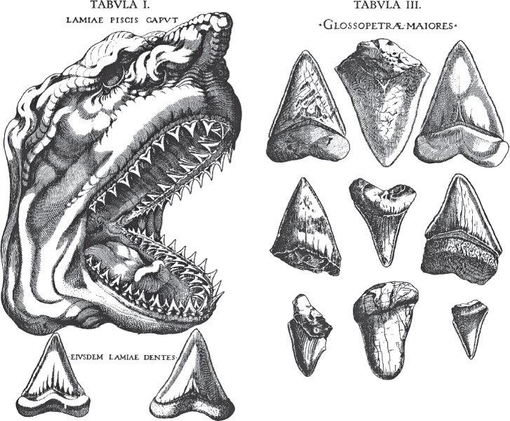 В 1666 г. внимание герцога привлекла гигантская белая акула, пойманная рыбаками в Средиземном море. Стенон по просьбе герцога провел препарирование и был поражен, увидев у акулы тринадцать рядов зубов. Ученый интуитивно понял, что зубы похожи на камни в форме языка – глоссопетры (glossopetrae) (рис. 1.1), которые были обнаружены в пластах горных пород высоко над уровнем моря [13]. Стенон не был первым, кто соотнес ископаемые глоссопетры с зубами живых акул, но он подтвердил эту догадку с помощью анатомического исследования, опубликовав результаты в 1667 г. [14] вместе с иллюстрациями препарированной головы акулы и образцами глоссопетр [15]. После этого ученые стали рассматривать окаменелости как останки древних животных, сохранившиеся в слоях осадочных пород. Стенон выдвинул гипотезу о том, что древние зубы, найденные в осадочных породах, превратились в камень в результате процесса «корпускулизации», при котором «корпускулы», или молекулы, исходного вещества были замещены молекулами минералов. Возникал еще один вопрос: почему эти окаменелые зубы находили так далеко от океана? Стенон пришел к выводу, что, вероятно, очень давно или поднялся уровень моря, в результате чего затопило сушу, или произошло поднятие дна океана, и образовался новый участок суши. Если верно последнее, то условия окружающей среды, должно быть, изменились кардинально.