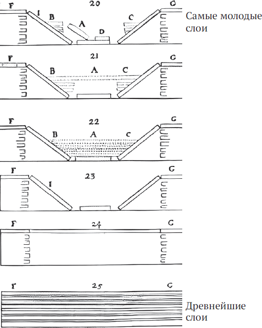 Стенон доказал, что ученый может раскрыть геологическую историю участка, исследуя и мысленно удаляя по одному слою в толще горных пород, начиная с вершины (самые молодые слои) и до основания (древнейшие слои). В результате появился принцип реконструкции (или бэкстриппинга – снятия слоев в обратном порядке). Эта процедура (рис. 1.2) начинается с анализа недавно сформировавшегося состояния (20 на рисунке), а затем, снимая один слой за другим во всей последовательности, ученый может прийти к расположению слоев (25 на рисунке) в более древние времена и таким образом понять, какие геологические процессы происходили.