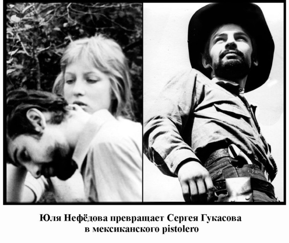 Юлечка, моя будущая жена, играла главную женскую роль — девушку из благородной семьи, попавшую в мою избушку после столкновения с бандой мерзавцев в грязном кабаке. Её героиню звали Джейн. Я играл человека, выручившего её из беды. Мой персонаж жил в дремучем лесу, где-то на краю цивилизации. В нашем фильме было всё, что должно быть в вестерне — любовь, кровь, многочисленные перестрелки, пустынные земли, горы. Не было только одного — хороших актёров. Мы играли отвратительно. Актёрская игра интересовала меня в те годы гораздо меньше, чем игра с кинокамерой и всяческими деталями, на которых я пытался создать атмосферу Дальнего Запада.