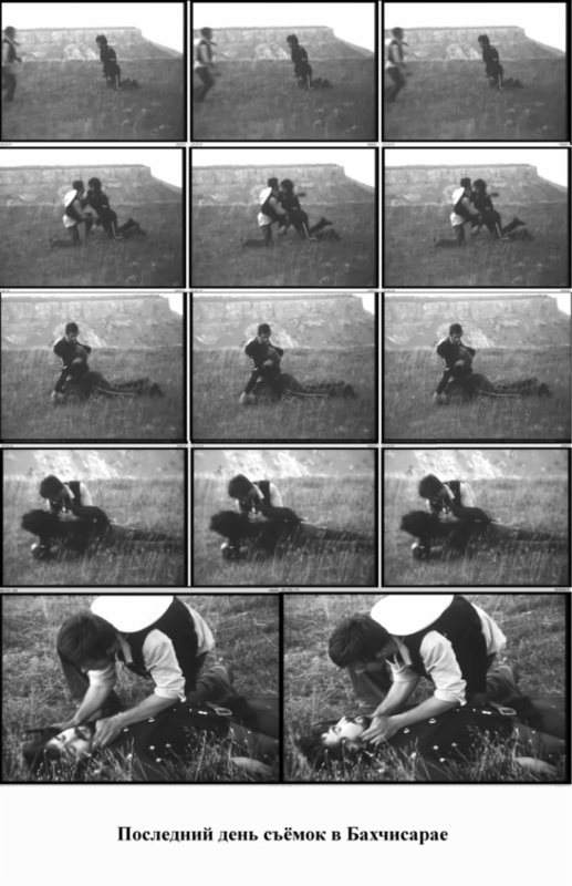 Правда, к заключительной сцене мы готовились тщательнее. Некоторые эпизоды я выверял долго, потому что там требовались и точные переходы трансфокатором с общего плана на крупный и многое другое. Увы, технический брак киноплёнки (возможно, при проявке) привёл к многочисленным белым разводам чуть ли на половине материала, поэтому получилось не всё, что мы делали.