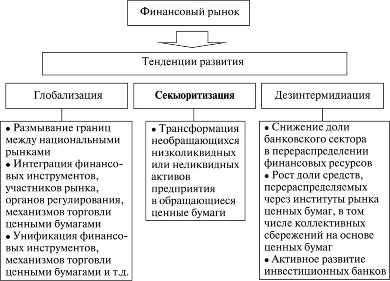 • секьюритизация, в широком смысле означающая повышение роли рынка ценных бумаг во всех сегментах финансового рынка.