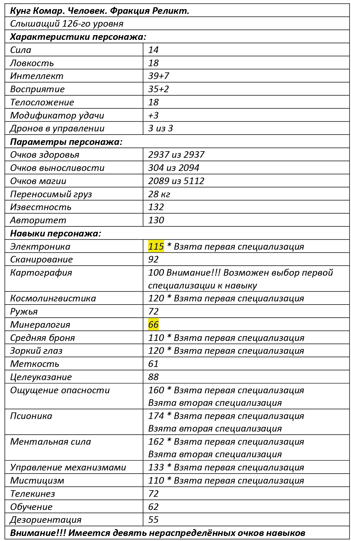 Выданный герд Мауу-Ла Мя-Сса кислющий витаминизированный коктейль с кофеином и другими стимуляторами помог взбодриться. Я вернулся на мостик и, пока время ещё было, занялся распределением очков персонажа. За время многочасового боя за Поко-Пока получил сразу три уровня, так что девять свободных очков навыков нужно было пристроить, чтобы они не сгорели в случае возможной смерти. Я открыл вкладку с характеристиками моего Комара: