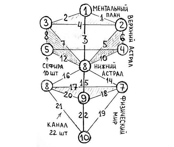 Для того чтобы работать с проведением энергий энергетических слоёв Земли, нужно хорошо представлять схему Дерева Сефирот (смотри русунок). Энергетическая структура сознания Дьявола представляет собой 10 антиканала и 22 канала. Древние маги пытались структурировать сознание Земли, создав пирамиды. В недрах этих пирамид находились устройства — модуляторы, изменившие силовые линии структуры сознания Дьявола. В результате возникли энергетические завихрения, обладавшие собственной частотой вибраций. Эти вибрирующие структуры начали взаимодействовать между собой, образовав каналы. Так возникла энергетическая структура в самом Дьяволе (Архангеле Земли), которая существует до сих пор. Вибрирующие зоны получили название антиканалы. Для того чтобы работать с этими каналами, были созданы Зоны Земли — вспомогательный инструмент, с помощью которого маги могли зацепиться за каналы и взаимодействовать с ними. Включаясь через зоны Земли в энергетические каналы, маги могут влиять на процесс мышления Дьявола. + Начнем нашу работу с 22-го слоя. 22-я зона соединяет антиканалы Малькут — «Царство» и Иесод — «Форма». Что представляет собой антиканал Малькут? Это наше представление о материальности.