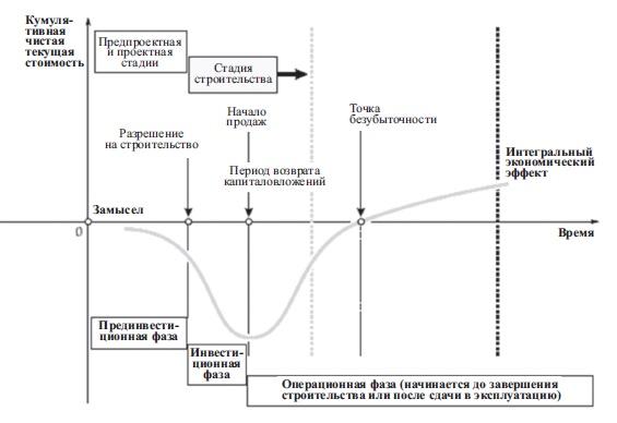 – инвестиционная фаза – с момента начала инвестиционных затрат до начала денежных потоков выручки от реализации продуктов инвестиционного проекта как операционной деятельности (при этом концепция проекта в течение данной фазы может претерпевать изменения). Совпадает со строительной стадией девелопмента до момента ввода объекта в эксплуатацию и оформления прав собственности;