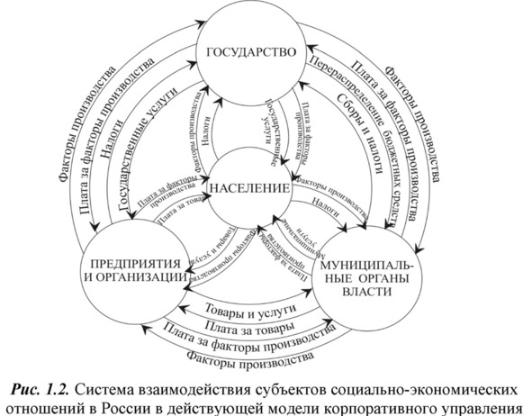 Вкладывая различные факторы производства в экономику, их владельцы ставят своей целью получение высокого уровня доходов в долгосрочной перспективе. Организация цивилизованного, правового взаимодействия субъектов социально-экономических отношений, как собственников на факторы производства, является весьма непростой задачей управляющей системы. Изменяя модель командно-административного управления на модель корпоративного управления, тем самым изменяется и сама система государственного и муниципального управления. Корпоративное управление рассматривается как система взаимовыгодного взаимодействия субъектов, обладающих правом собственности на факторы производства, объединяющая их в экономических процессах. Принятая в России в качестве базовой англо-американская модель корпоративного управления, принципиально изменила цели, задачи и полномочия органов государственной и муниципальной власти. Развитие модели корпоративного управления в России предполагает кардинальное изменение всех нормативно-правовых и организационно-административных документов, исключая с одной стороны, вмешательство административно-управленческих органов в экономические процессы, а с другой, направляя и организуя развитие экономики так, чтобы учитывались интересы всех сторон, связанных корпоративными отношениями. На микроуровне корпоративными отношениями объединяются следующие субъекты: акционеры, управляющие и исполнительные органы, структурные подразделения, поставщики, посредники и другие партнеры, обладающие факторами производства. На государственном уровне к субъектам корпоративных отношений относятся: домашние хозяйства (население), предприятия, организации, учреждения (бизнес), государства и муниципалитеты. Существующие между ними связи можно представить в виде рис.1.2.