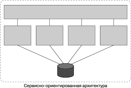 Говоря о сервисно-ориентированной архитектуре, мы имеем в виду не архитектуру вообще, основанную на сервисах, а скорее особый гибридный архитектурный стиль, следующий распределенной многоуровневой структуре, которая состоит из отдельно развернутого пользовательского интерфейса, отдельно развернутых удаленных сервисов и монолитной базы данных. Эта архитектура решает одну из проблем, свойственных микросервисам, — разделение на уровне базы данных. Сервисы в сервисно-ориентированной архитектуре следуют тем же принципам, что и микросервисы (на основе ограниченного контекста в предметно-ориентированном проектировании), но полагаются на единую реляционную базу данных, поскольку архитекторы не видели смысла в ее разделении (или видели слишком много негативных компромиссов).