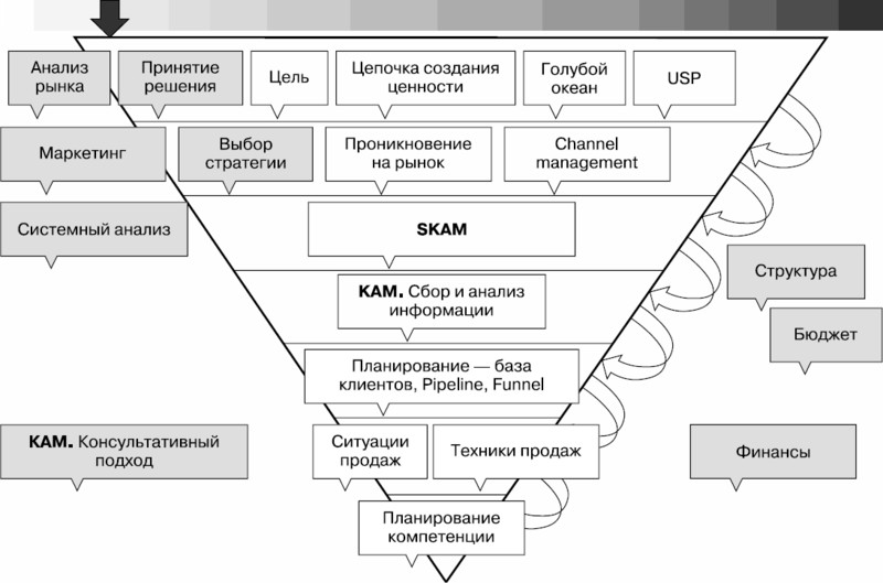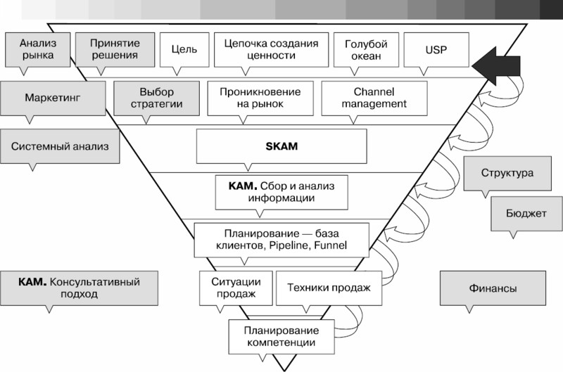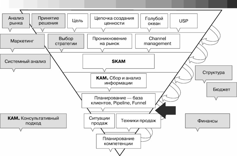 Как построена книга? Ее структура отражает структуру концепции оценки системы продаж. И выглядит она как перевернутая пирамида.