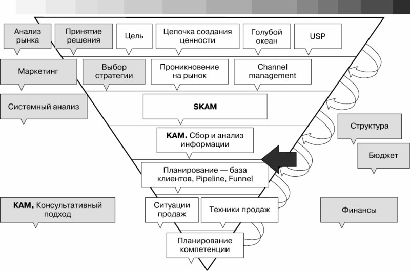 Итак, планирование. Когда мы определились с оболочкой и с тем, чем у нас занят операционный КАМ, мы переходим к следующему этапу – это планирование результата, деятельности и клиентской базы, а также Pipeline и другие специальные инструменты планирования и прогнозирования продаж.