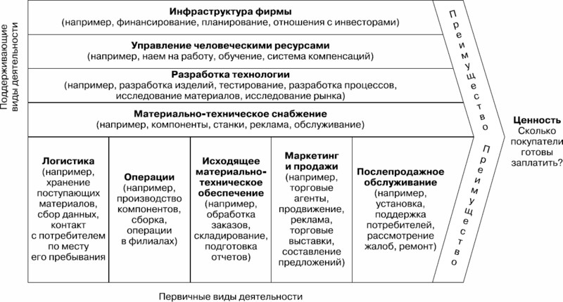 Идея Портера была очень занятная для его времени. Он говорил, что стоит рассматривать этапы производства товара/услуги с точки зрения того, во сколько нам обходится каждый этап. Причем этапы он предлагал рассматривать в довольно узком смысле: сколько стоит конкретный шаг. Эта этапность помогает понять, во что нам обходится каждый шаг и стоит ли он таких затрат. Так создается конечная стоимость продукта.