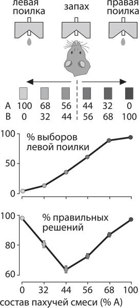 Крыс научили выбирать одну из двух поилок в зависимости от того, запах какого из двух пахучих веществ – А или Б – преобладает в воздухе. В роли вещества А выступала капроновая кислота, в роли вещества Б – 1-гексанол. Если крысе давали понюхать смесь с соотношением A/Б > 50/50, крыса должна была выбрать левую поилку, при А/Б < 50/50 – правую. За правильный выбор крысу награждали (давали каплю воды). Награда, однако, появлялась не сразу – крысу заставляли ждать у выбранной поилки, мучаясь неопределенностью, от 0,3 до 2 секунд.