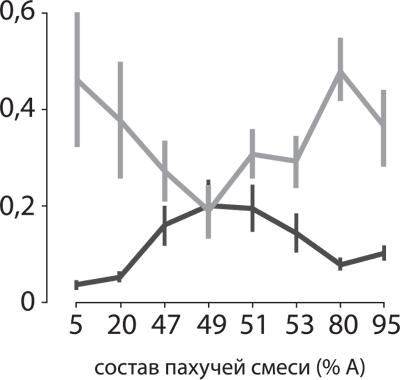 Меняя соотношение веществ А и Б в пахучей смеси, исследователи могли регулировать сложность задачи. Понятно, что чем ближе это соотношение к 50:50, тем труднее крысе сделать правильный выбор. Как и следовало ожидать, крысы ошибались тем чаще, чем сложнее была задача (см. нижний график на рисунке).