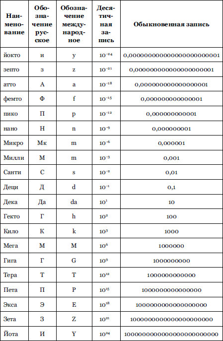 Таблица 1. Приставки и множители десятичных кратных и дольных единиц международной системы СИ