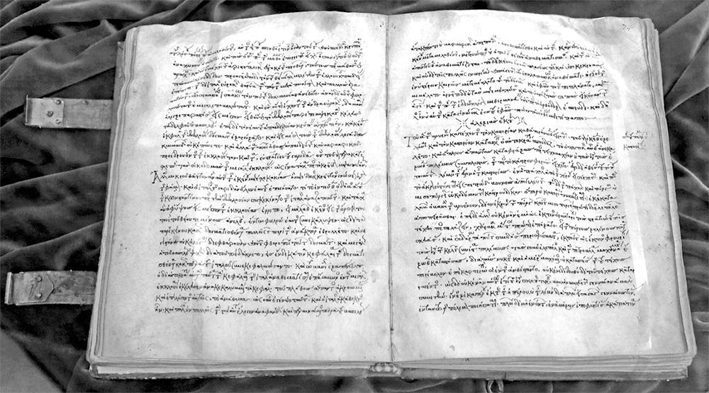 Историки уверяют нас, что «Алексиада» была создана в XII веке и показывают переплетенную рукописную книгу якобы XII века, рис. 2. Мы видим прекрасный аккуратный шрифт, великолепную сохранность. Толстый переплет, кожаные застежки. Текст разбит на отдельные слова, все греческие буквы и надстрочные знаки хорошо различимы. Все это порождает сомнение в том, что этой рукописи около восьмисот лет. Подобного рода роскошные книги создавались уже в эпоху Просвещения XVII–XVIII веков.