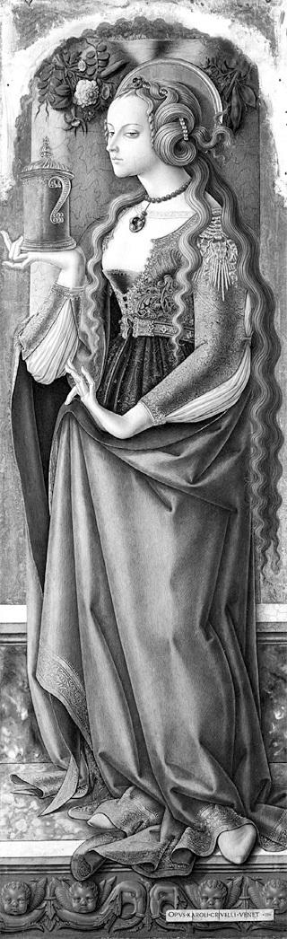 Рис. 9. Мария Магдалина. Карло Кривелли. Якобы между 1480 и 1490 годами. Боннефантенмузеум. Берлин. Взято из Интернета. Святая изображена с длинными распущенными волосами.