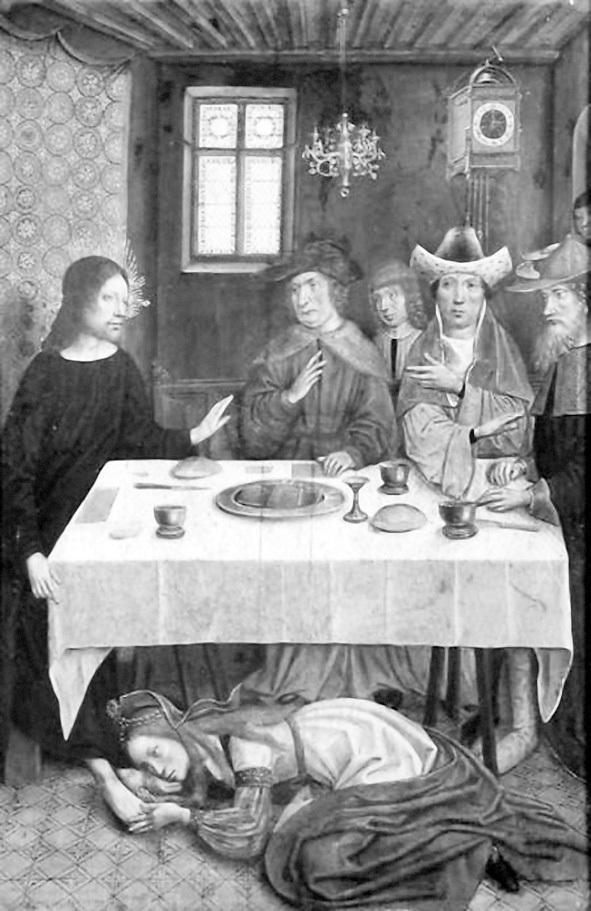 Рис. 12. «Христос в доме Симона Фарисея», анонимный мастер, французская школа. «И вот, женщина того города, которая была грешница, узнав, что Он возлежит в доме фарисея, принесла алавастровый сосуд с миром и… начала обливать ноги Его слезами и отирать волосами головы своей, и целовала ноги Его, и мазала миром» (Лука 7:37–48). Изображение взято из Интернета.