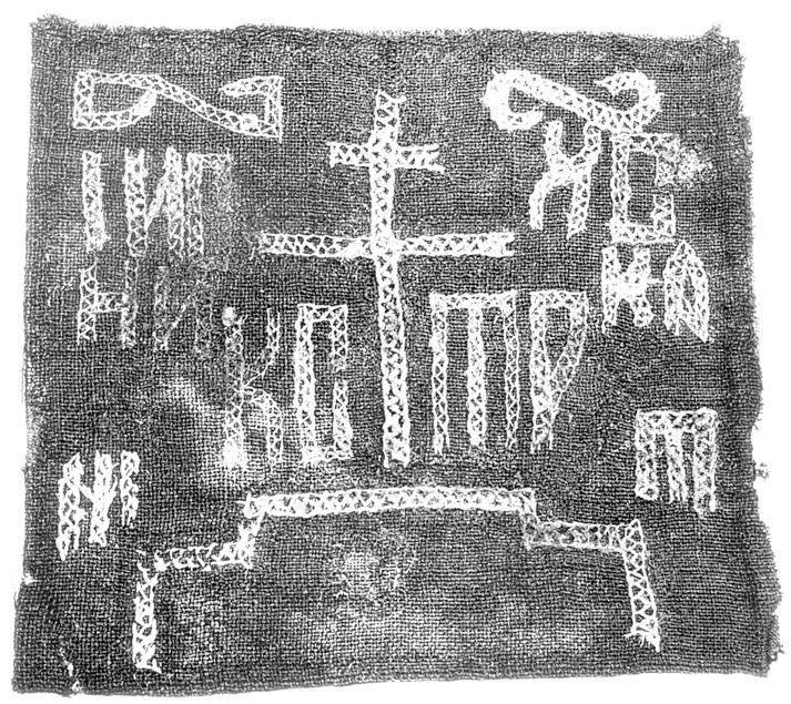 Рис. 13. Старый параман, ткань, шитье. Музей археологии города Москвы. Изображен крест на Голгофе. Вокруг креста-надписи: IИС ХС, НИКА, КСТР и МТ, то есть Матерь Теос = Матерь Божия. Здесь буквосочетание КСТР получилось, скорее всего, из сокращения КО-ТР, то есть КОПИЕ-ТРОСТЬ. По сторонам от креста часто изображались копие и трость. Но благодаря небольшой подтёртости получилось вполне осмысленное в данном случае слово КСТР, то есть КОСТЕР, башня, возвышение, по-старорусски. Так слово КОСТЕР могло стать одним из имен горы Голгофы. Взято из [305:1], с. 53.