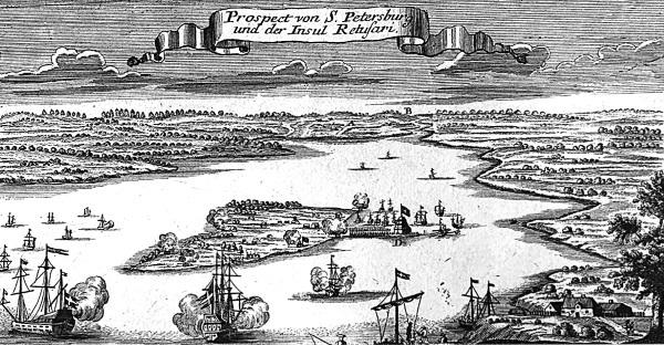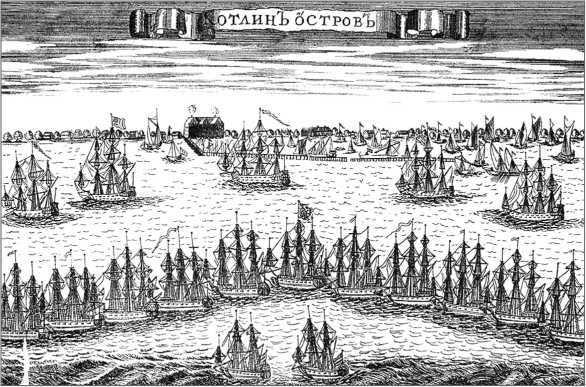 В России хорошо сознавали важность этой потери, и в 1656 г. царь Алексей Михайлович решил занять все побережье Финского залива от Невы до Риги и, кроме того, берега Ладоги. Для этого были сформированы четыре отряда, одновременно направившиеся по четырем разным направлениям. Отряду воеводы и стольника П.И. Потемкина следовало «идти на Свейский рубеж на Варяжское море». Ему «дано было 1000 человек и в том числе, на случай морских экспедиций, были кормщики и отправленные из Москвы 510 донских казаков как опытные и бывалые моряки»[21]. Воевода вступил в Ингрию, сжег Канцы и обложил Орешек, простояв под ним до осени. Однако до этого, 22 июля, Потемкин успел сделать морской набег. Ходил он «с ратными людьми судами на море, и у Котлина-острова с немецкими людьми был бой, и милостию Божиею и Пречистые Богородицы помощию и всех святых молитвами… у Котлина-острова полукорабль взял, и немецких людей побили, и языка поймал, начального человека капитана Ирека Далсфира, 8 человек солдат и наряд (т. е. пушки. – Л. А.) и знамена поймали, а на Котлине-острове латышане деревни высекли и пожгли»[22]. Из этого следует, что Котлин населен был, видимо, давно, хоть и весьма незначительно. И шведы опорного пункта здесь не имели, что несколько удивительно для опытных шведских военачальников.
