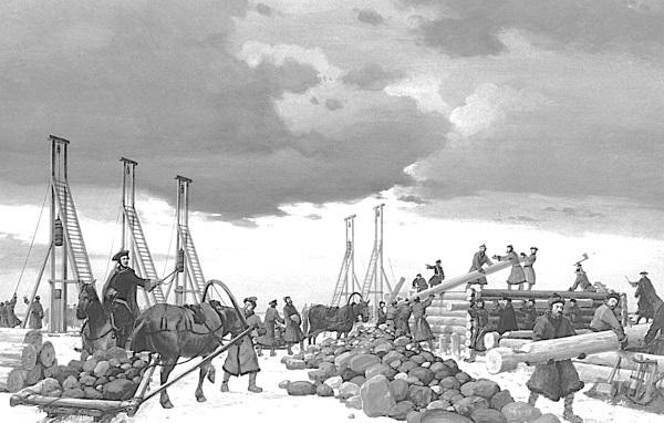 Перестройка гаваней по новому проекту началась в 1717 г. Периодически работам мешали шторма и наводнения. По данным С.П. Луппова, «за 22 года – с 1703 по 1725 г. – в Петербурге было 11 больших наводнений»[89]. Однако имеются данные и о наводнениях, случавшихся в допетровскую эпоху и существенно осложнявших жизнь прибрежных селений и Ниена. В весеннее половодье и в осенние шторма вода поднималась здесь на 2–2,5 м выше ординара. Шторма, наводнения и лед разрушали берега и укрепления Ниеншанца, все «крушилось, смывалось прочь под ударами волн, так как валы были сделаны из земли, смешанной с глиной и песком, и не могли противостоять водной стихии».