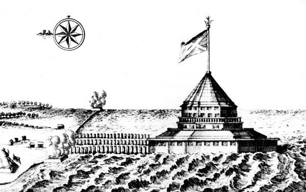 О начале работ на «Кроншлоте» капитан Э. Лейн доложил адмиралу Ф.М. Апраксину 4 декабря 1715 г. Форт «Новый Кроншлот» представлял собой «вытянутый пятиугольник бастионного начертания. Башня, расположенная в юго-восточном углу, была окружена анвелопой [70] на срубах. Все фронты – рубленые стенки на ряжевых основаниях с брустверами и батареями – образовывали просторную внутреннюю гавань с тремя воротами для входа кораблей»[71]. По данным РГАВМФ, которые приводятся в книге Б.А. Розадеева и др. («Кронштадт. Архитектурный очерк»), первоначально имелись только одни ворота, еще двое ворот сделали позднее.