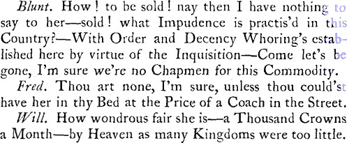 . Cromwell’s parliament passed Draconian Acts punishing adultery, incest, fornication, with death; the two former on the first offence, the last on the second conviction. Mercurius Politicus, No. 168. Thursday, 25 August— Thursday, 1 September, 1653 (p. 2700), records the execution of an old man of eighty-nine who was found guilty at Monmouth Assize of adultery with a woman over sixty. It is well known that under the Commonwealth the outskirts of London were crowded with brothels, and the license of Restoration days pales before the moral evils and cankers existing under Cromwell. The officially recognized independent diurnals Mercurius Democritus, Mercurius Fumigosus, have been described as ‘abominable’. In 1660, when the writers of these attempted to circulate literature which had been common in the preceeding decade, they were promptly ‘clapt up in Newgate’.p. 411, l. 12 and I shall keep it. 1724 omits ‘I’.