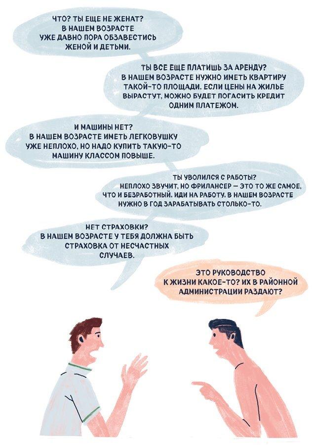 Им нет конца. Я никогда не думал, что вещей, которые «конечно же» должны быть в моем возрасте, так много. В нашем обществе у людей есть «руководство к жизни», в котором говорится, что «в таком-то возрасте» у каждого должно быть «это и это». На самом деле никто его никогда не держал в руках, но все о нем знают. И стараются жить соответственно. Потому что иначе жить страшно. Ведь кажется, что ты единственный отстающий.