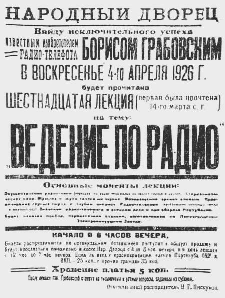 17 сентября 1922 года в Москве впервые прошел радиоконцерт. Он открылся словами, ставшими традиционными: «Слушайте! Говорит Москва!» В программу первого радиоконцерта были включены: романс в исполнении Надежды Обуховой, выступления артистов Большого академического театра Василия Качалова и Антонины Неждановой. Они транслировались из Центральной радиотелефонной станции имени Коминтерна на Шаболовке. Нельзя сказать, что первый радиоконцерт произвел фурор в народных массах, и дело было не в качестве исполнения, а в том, что радиоприемники пока были далеко не в каждом доме.