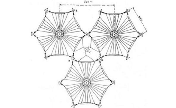 Проводники полотна совместно с поддерживающими их центральными мачтами напоминали три гигантских зонта диаметром около одного километра каждый. Подобную конструкцию иногда называют зонтичной антенной.