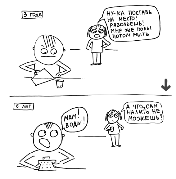 – Нет, ты долго будешь копаться, давай я тебя быстро одену. (И при этом мамы сверяют достижения ребенка с таблицей развития – в каком возрасте ребенок должен уметь самостоятельно одеваться.)