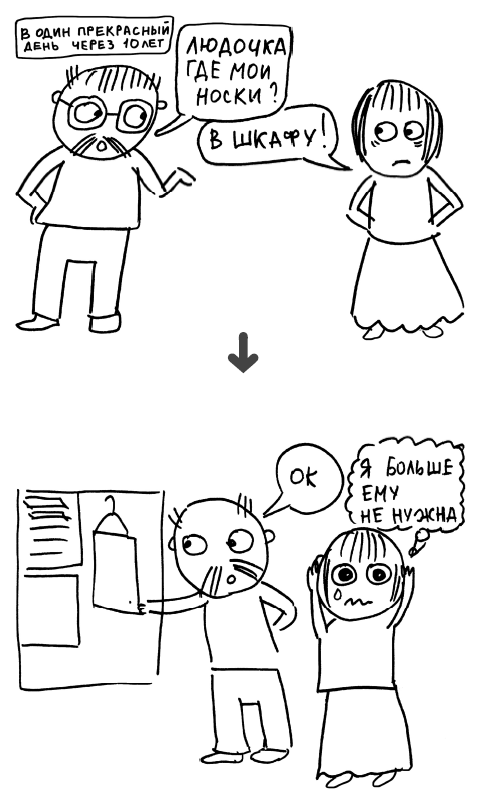 – Мы живем вместе уже десять лет, и каждое утро начинается с вопроса: «Люба, где мои носки?» Это же невыносимо!