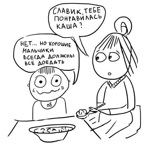 Глаза Славика округлились от удивления. Он не знал, что так можно. Что можно хотеть или не хотеть. Что можно самому принимать решение: доедать или оставить. Что можно сообщать о своих желаниях. И что можно ожидать: другие будут с твоими желаниями считаться.