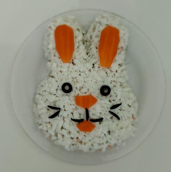 Все ингредиенты для салата мелко режем кубиками, перемешиваем, добавляем майонез, 1—2 ст. л., выкладываем в виде зайца, сверху кладем мелко нарезанный белок, морковью и оливками завершаем украшение.