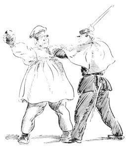 “I ain’t no Sparhawk!” fairly shouted the enraged woman, as with a furious shove she sent the Cumbersome Horse staggering down the doorway mound; “this here’s Hiram Skinner, the meanest man in Pike County, and I’m his wife, let out to do day’s work! You’ve had one week of him—how would you have liked twenty years?”