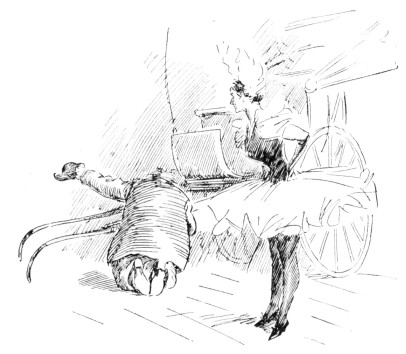 As he stood there and gazed out into the twilight, two forms suddenly approached him. Around one corner of the house came Mrs. Sparhawk on her way home. Around the other came an immensely tall, whitish shape, lumbering forward with a heavy tread. Before he knew it, it had scrambled up the side of his mound with a clumsy, ponderous rush, and was thrusting itself directly upon him when he uttered so lusty a cry of dismay that it fell back startled; and, wheeling about a great long body that swayed on four misshapen legs, it pounded off in the direction it had come from, and disappeared around the corner. Mr. Brimmington turned to Mrs. Sparhawk in disquiet and indignation.