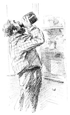 But of all the noises that startled Mr. Brimmington, in the first week of his sojourn in the farm-house, the most alarming awakened him about eight o’clock of the following morning. Hurrying to his study, he gazed in wonder upon a scene unparalleled even in the History of Prehistoric Man. The boards had been ripped off the curious structure which was supposed to have served the hardy settlers for a wall-bench and a dresser, indifferently. This revealed another structure in the form of a long crib or bin, within which, apparently trying to back out through the wall, stood Mr. Skinner, holding his tool-box in front of him as if to shield himself, and fairly yelping with terror. The front door was off its hinges, and there stood Mrs. Sparhawk wielding a broom to keep out the white horse, who was viciously trying to force an entrance. Mr. Brimmington asked what it all meant; and Mrs. Sparhawk, turning a desperate face upon him, spoke with the vigor of a woman who has kept silence too long.