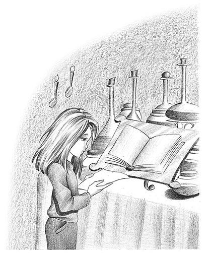 Она остановилась перед камином и уставилась на тигель, стоящий на огне, в котором, как обычно, кипела основа для алхимических препаратов, состоящая из сапфировой пыли и золота. Потом снова повернулась в сторону магической Книги и, к своему большому удивлению, заметила, что из нее торчит листок.