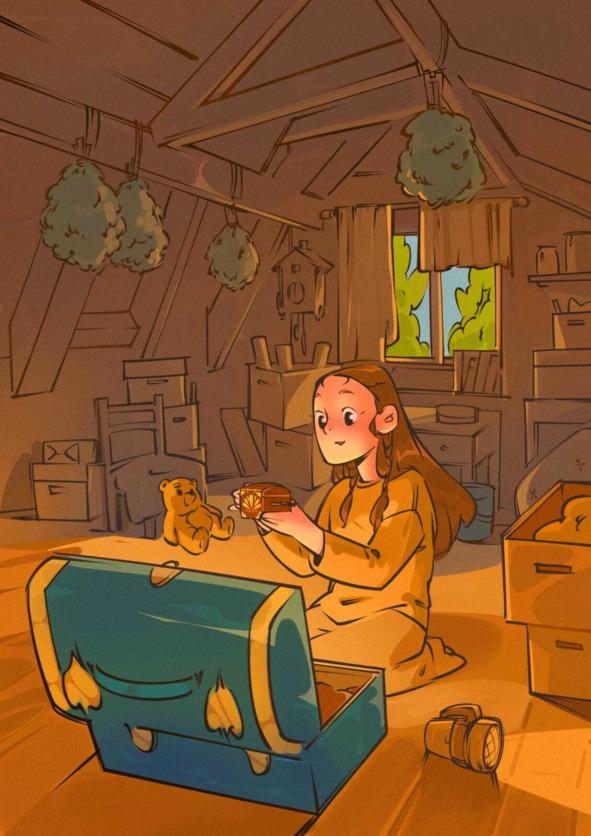 Вдруг Софи услышала доносившуюся до нее тихую и даже еле слышимую приятную музыку, как на заводной игрушке или шкатулке. Она обернулась и заметила в дальнем углу старый сундук, от которого исходило некое свечение. Соню прям манило туда подойти и чем ближе она приближалась к сундуку, тем теплее и спокойнее ей было на душе. Другая маленькая девочка давно бы уже испугалась и убежала, но не Соня. Смелая девочка без лишних раздумий сняла лежащие на сундуке покрывала и открыла сундук, чтобы посмотреть, что же ее там так привлекло.