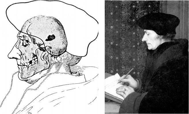 Рис. 6. Облик Эразма Роттердамского известен потомкам, благодаря портрету кисти Ганса Гольбейна младшего. Профессор Вертеманн попробовал «вписать» череп Эразма в контуры картины. Любопытно, что маленькую голову маскирует огромный берет.