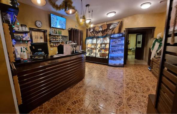 Стойка бара находится рядом со входом-выходом. Очень даже неплохая кухня, шустрые ребята-официанты — вот и все, что можно рассказать вкратце об этом зале. Все удобно, комфортно и хорошо, поэтому долгих описаний не ждите. Заказать все виды массажа, от парения до помывки, можно прямо на стойке.