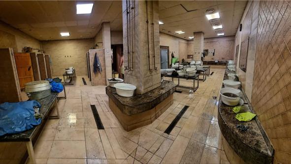 Для наиболее удобной помывки вдоль стен и посреди помещения тут устроены лавочки, уставленные тазами с торчащими из них вениками. Пять душевых, которых вполне достаточно, также имеется пара ведер-водопадов с холодной водой, все это расположено рядом с дверями в русскую парилку.