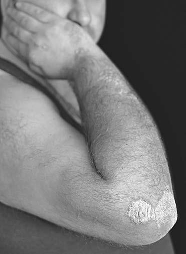 Этот обычный псориаз может появиться на любом участке кожи, однако чаще всего высыпания встречаются на локтях (рис. 1.1), коленях, ступнях, в волосистой части головы, иногда на ногтях, мягких тканях рта и гениталий, в кожных складках. Постепенно папулы разрастаются, сливаются друг с другом и образуют бляшки, которые постепенно утолщаются.