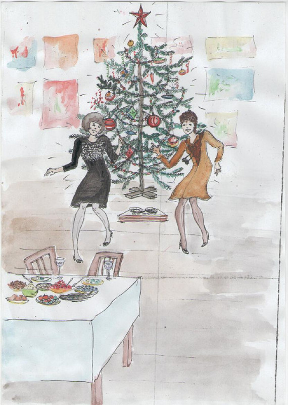 Переписали. «Мишель», «Ес ту дей» и тому подобные – на «медленную» катушку, «Береговые парни» – на «быструю». Подписали бабины, сложили по отдельности. Покончив с подборкой музыки, девочки купили 10 листов ватмана, акварельные краски и принялись рисовать Новогодние картинки. Взбудораженные творческим подъемом, они с азартным смехом, придумали Деда Мороза, танцующего в трусах до того самозабвенно, что от него летели огромные капли пота. (Естественно Дед М. танцевал «твист») Потом появилась «хиповая» Снегурочка в «мини» и модных красных сапогах на высоком каблуке. Ну и, конечно, ежики, зайчики, часы со стрелками на «12», украшенные еловыми ветками, серпантином и конфетти.