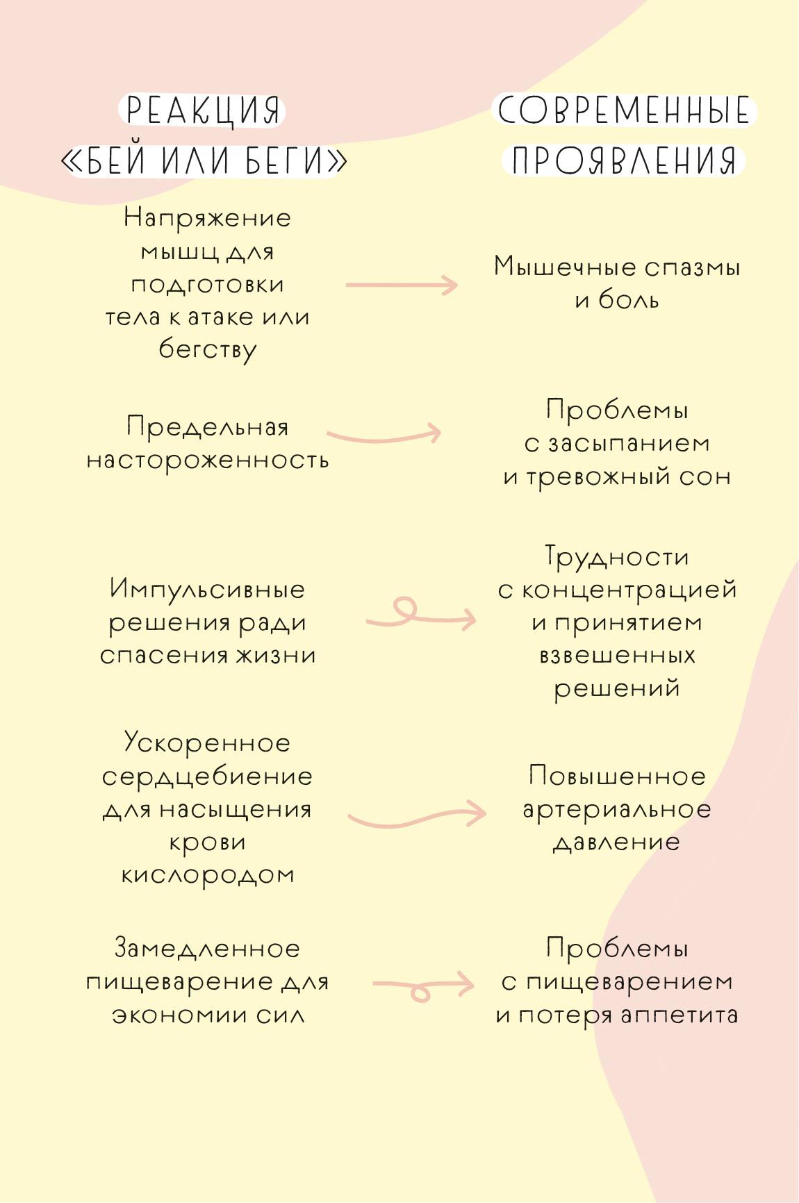 Также не забывайте, что слишком трудно пробовать все и сразу (хотя, если вы настроены именно так, ваш энтузиазм заслуживает восхищения). Позвольте себе идти маленькими шажками. Радость от того, что вы достигли небольшой цели, будет давать вам стимул двигаться дальше и ставить новые задачи. Я надеюсь, что эта книга поможет вам избавиться от всего лишнего. Душевный покой — наше естественное состояние. Оно доступно каждому. Но стрессовые ситуации, с которыми мы сталкиваемся каждый день, заставляют нас переходить в режим «бей или беги».