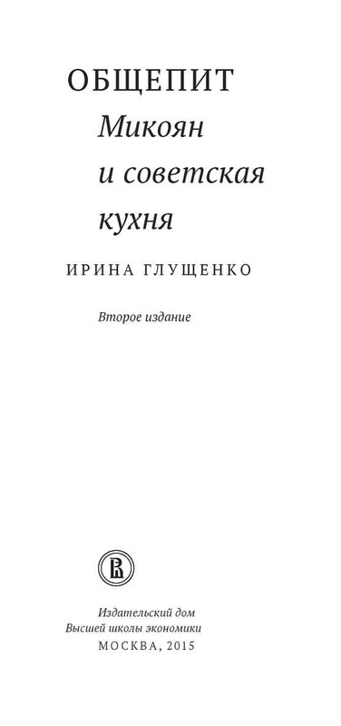 Г55 Общепит. Микоян и советская кухня [Текст] / И. В. Глущенко; Нац. исслед. ун-т «Высшая школа экономики». — 2-е изд. — М.: Изд. дом Высшей школы экономики, 2015. — (Исследования культуры). — ISBN 978-5-7598-1307-1 (в пер.).