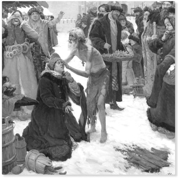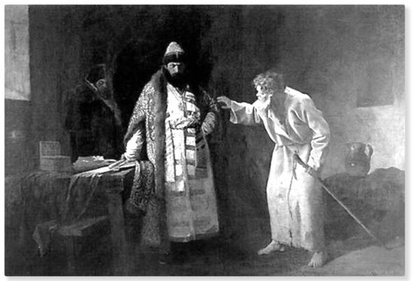 — «То, сынок, не князь, а грязь, — возразил блаженный, — шлите-ка скорее послов в Москву, добивайте челом московскому князю за свою вину, а не то придёт он на Новгород со всеми силами своими, выйдете вы против него, и не будет вам Божьего пособия, и перебьёт он многих из Вас, а ещё больше того в Москву сведёт, а князь Михаил от Вас в Литву уедет и ни в чём Вам не поможет».