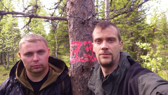 За озером Суккозеро брали образцы хвои сосны и ели для генетических исследований в Москве. В этом году подкинули нам, такую радость в работе, добавив довольно таки трудоёмкой задачей. Ведь нужно найти подходящий по методике лесной выдел, определится в натуре с таксационным выделом и кварталом, взять тридцать образов хвои с разных деревьев, причём деревья должны отступать не менее 10 метров друг от друга. А если по закону подлости выдел не столь большой и просто деревьев не хватает? Первый раз всегда прикольно, а то, что поздно, ночь на дворе, и дождик идёт, так это к нашему руководству или точнее к нам самим. Сетка ППНов большая 64х64 км, езды много, ходьбы и т. д. тоже, рабочего дня никак не хватает на 1 точку, а план красив и суров. А тут ещё образцы. Начинаем гнать потогонку, много езды на машине, причём в тёмное время суток, дорожки тут ещё те, Володька нервничает, мы помалкиваем втихую.