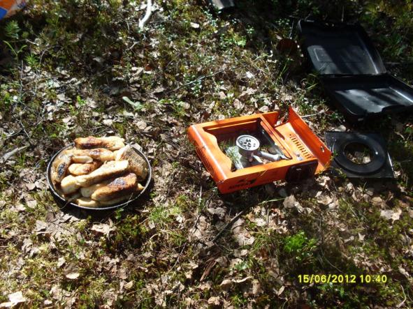 Отработали 2 точки учёта и перекусили. С собой в рюкзаках взяли чай, хлеб, колбасу и сыр. Был ещё паштет, но он как-то не пошёл. Видать сказывается начало командировки, ещё не оглодали на вольных хлебах, после домашней кормёжки.